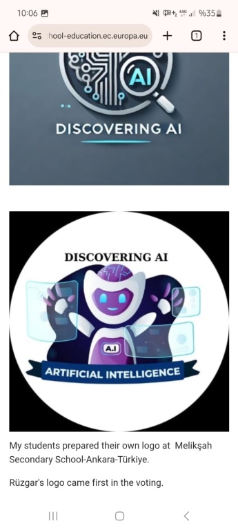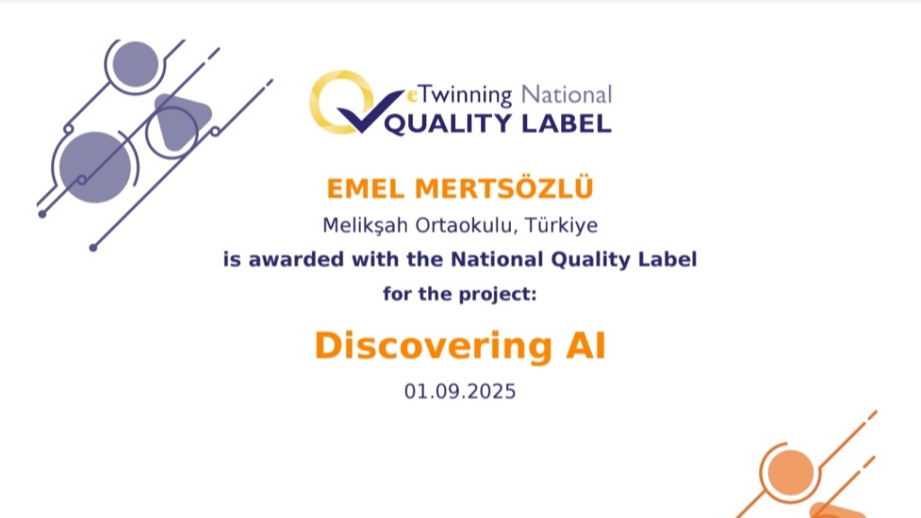 Okulumuzda yürütülen Türkiye,Romanya,Hırvatistan, Yunanistan ortaklı ve yapay zeka temalı uluslararası eTwinning projesi "Discovering AI",Ulusal Destek Servisi tarafından kalite etiketi ile ödüllendirilmiştir.